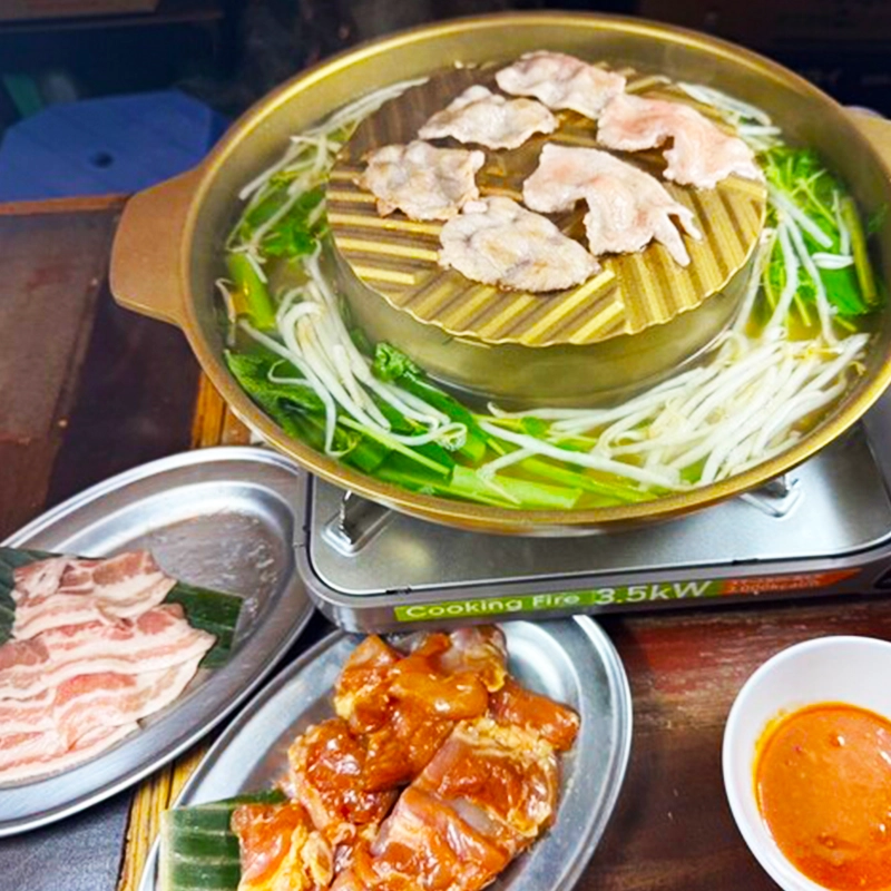 特製ダレに漬け込んだ豚肉や鶏肉などを自分で焼きながら、溶け出した旨味が染み込むスープも一緒にお楽しみいただけます。
